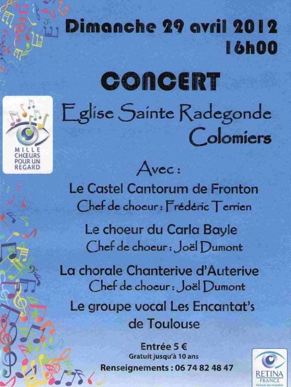 Notre chorale frontonnaise se produisait en concert ce dimanche à l'église St Radegonde de Colomiers au profit de la recherche médicale en ophtalmologie soutenue par l'association Rétina France.