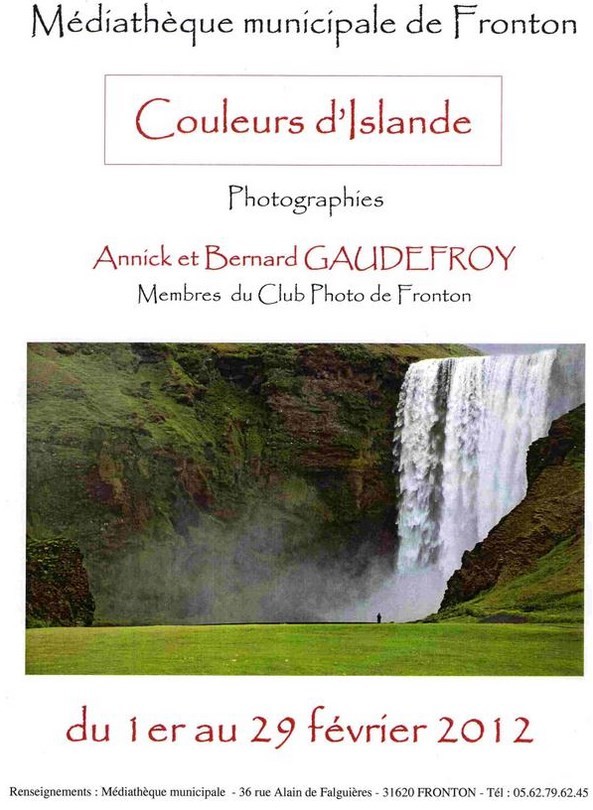Direction l'Islande pour cette exposition photos proposée par la médiathèque. Annick et Bernard Gaudefroy au travers des superbes images qu'ils nous proposent, nous ont permis de découvrir ce pays et les divers paysages qu'il peut nous offrir.