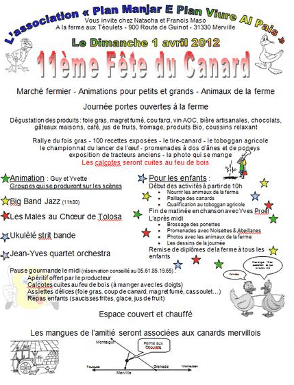 Comme d'habitude cet événement qui se déroule deux fois par an fut une réussite. Le soleil étant en plus de la partie. Nous avons dégusté le canard sous toutes les préparations culinaires possibles et inutile de vous dire que nous nous sommes régalés. De nombreux groupes musicaux ont animé cette journée et des artistes et producteurs locaux présentaient leur savoir faire.