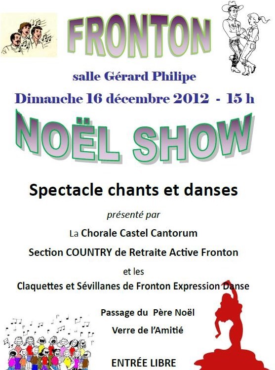 Cette année encore trois associations se sont regroupées afin de nous proposer un spectacle varié de qualité. La chorale Castel Cantorum sous la direction de Frédéric Terrien interpréta les principaux succès de son répertoire en y ajoutant bien évidemment des chants de Noël. La danse entrecoupa le concert avec la section Country de Retaite Active qui nous entraîna dans le Far-West. Nous avons également voyagé chez nos voisins ibériques grâce aux sévillanes d' Expression Danse. Le père Noël était de sortie et il distribua aux enfants présents des friandises avant que le nombreux public se retrouve autour du superbe buffet afin de déguster toutes sortes de pâtisseries autour du verre de l'amitié.
