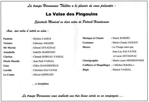 L'année dernière la troupe de Villaudric Harmonie Théâtre nous avait enthousiasmé avec avec"Frou frou les bains", cette année elle récidive en nous présentant "La valse des pingouins". C'est à nouveau un spectacle musical où les acteurs poussent la chansonnette. Les comédiens maîtrisent de mieux en mieux les vocalises. Ils ont enthousiasmé la salle où il ne restait plus une place de libre avec cette comédie qui nous a fait rire du début à la fin.