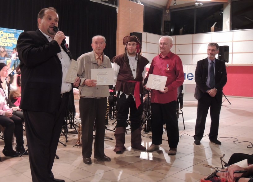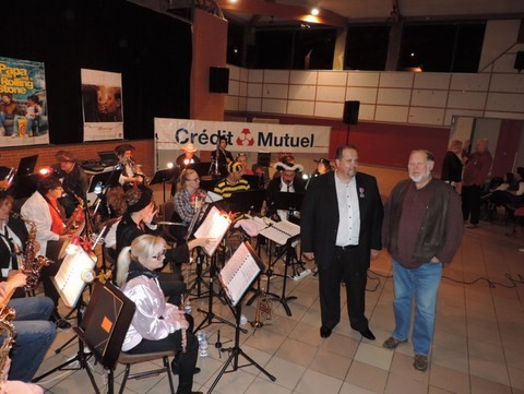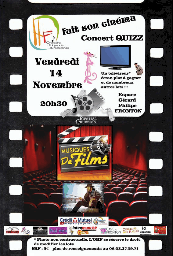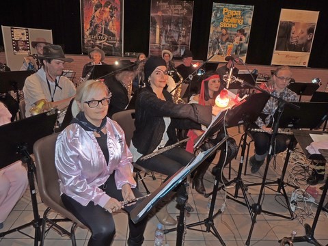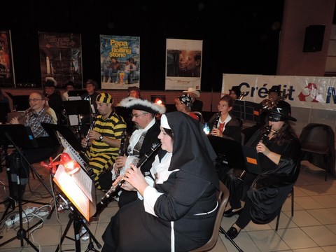 L'Harmonie du frontonnais nous a proposé un concert dont le thème était les musiques de films. L'orchestre dont les membres étaient déguisés, nous a régalé en nous interprétant des morceaux dont quelquefois trois ou quatre notes suffisaient à nous rappeler le nom du titre. En effet qui ne se souvient pas de : Rabbi Jacob, un homme et une femme, le bon la brute et le truand.... Sauf que là un questionnaire de 25 questions nous attendait et après la facilité place à plus compliqué : Titre non indiqué, deux air dans le même morceau !!!! Bernard Gautherin qui dirigeait l'Harmonie et Christophe Leroux le précident se sont bien amusés à nous compliquer la tache, il faut dire que l'enjeu en valait la peine, un écran plat et de nombreux autres lots récompensaient ceux qui avaient le plus de réponses justes (j'ai encore beaucoup de progrès à faire !!). A l'entracte trois personnes ont été médaillés par Serge Hilar (Président Groupement Régional Fédération Musicale) pour leur implication auprès de l'Harmonie du frontonnais et avant cela dans la Lyre se sont Marius Constans, André Prévost et .....Bernard Gautherin.Une agréable soirée à reproduire rapidement.