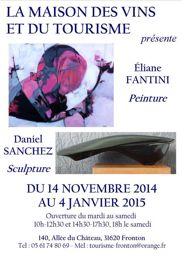 Jacqueline Coquet nous accueillait à la maison des vins afin de nous présenter les tableaux d'Eliane Santini et les sculptures de Daniel Sanchez . Beaucoup de monde assistait à ce vernissage.Native de Lectoure, Eliane Fantini est une artiste peintre autodidacte, coloriste de grand talent , très appréciée des critiques Par une harmonie étonnante de couleurs généreuses tantôt intenses, tantôt subtiles, elle transpose dans son oeuvre ses émotions en larges touches en lui donnant rythme, force et équilibre. Elle privilégie ainsi l'alchimie et la symbolique de ces couleurs. Au gré du temps, sa technique s'enrichit de la sensualité des pâtes picturales brossées ou caressées au couteau.