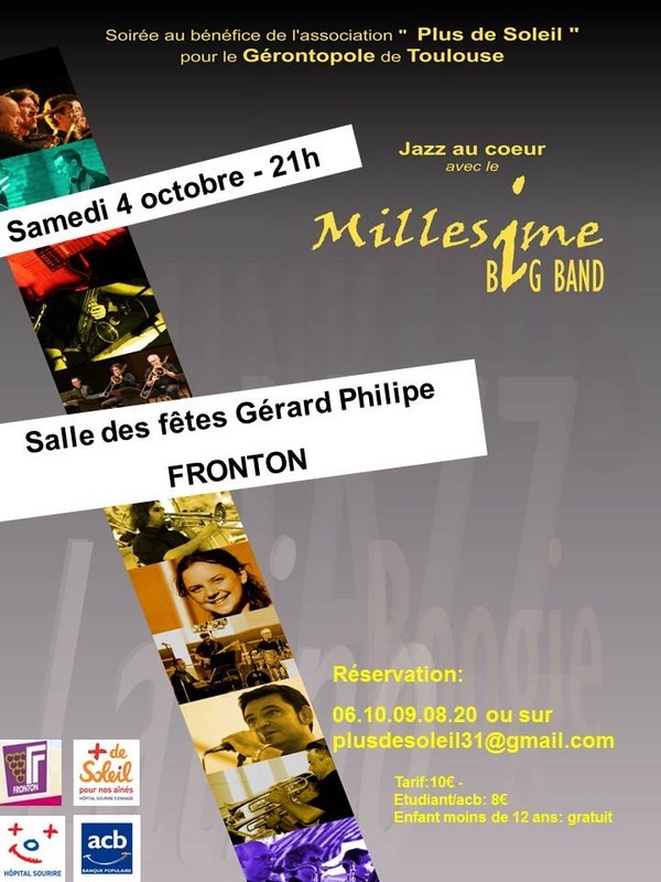 L'association Plus de Soleil/Hôpital Sourire proposait un concert de jazz à la salle Gérard Philipe. Les spectateurs ont joint l'utile à l'agréable en écoutant le Millésime Big Band et aidant cette association, en effet la recette leur était destinée.Créé il y a plus de 20 ans par des copains musiciens passionnés de jazz, le millésime Big Band composé aujourd'hui de 17 musiciens et un chanteur, est resté fidèle à la plus pure tradition des Big Band.