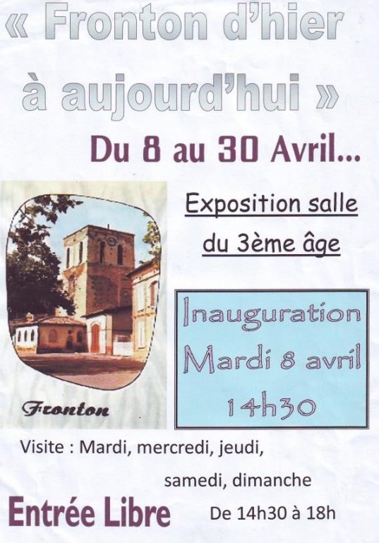 Le club des aînés de Fronton présente jusqu'au 30 avril dans la salle derrière la mairie, une exposition photo ayant pour thème "Fronton d'hier à aujourd'hui". Photos de classes, Bâtiments et rues tels qu'ils l'étaient autrefois, travail de la terre sont exposés sur des panneaux qui entourent d'anciennes tables d'école. La présidente du club des aînés, Marie Rose Polato qui était présente fut un guide parfait.