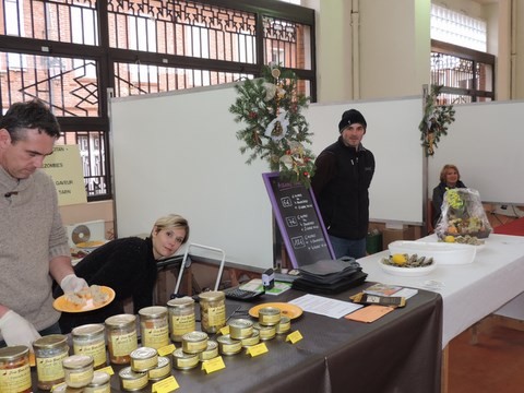 Pendant deux jours, avec une nocturne jusqu'à 22 heures le samedi, la mairie de Fronton nous proposait son traditionnel Marché de Noël. Cette année un seul objectif, faire revivre l'esprit et l'ambiance de Noël pendant un week-end au cœur du village. Parmi les nombreuses activités, la découverte était au rendez-vous avec l'équipe de la Maison des vins sous la Halle, qui nous a fait déguster un échantillon gourmand et varié des vins AOP Fronton. En partenariat avec un chocolatier local, Lilian Bonafous, elle a souhaité valoriser l'alliance délicate des vins et du chocolat autour d'ateliers spontanés et de coffrets sélectionnés.Et ce n'est pas tout... pour les petits creux, les pauses apéro entre copains et famille, un espace convivial permettait de déguster autour d'un verre, des huîtres, une assiette de foie gras ou un fabuleux jambon Pata Négra que le producteur détaillait en fine lamelles. Les gourmands pouvaient se rassasier avec des pâtisseries orientales, des confitures et des produits de Grèce et d'Italie. Un torréfacteur était présent ainsi que le traiteur frontonnais Jean Marc Lavaille, de son coté le lycée vendait des gâteaux fait maison au profit de la coopérative scolaire.
