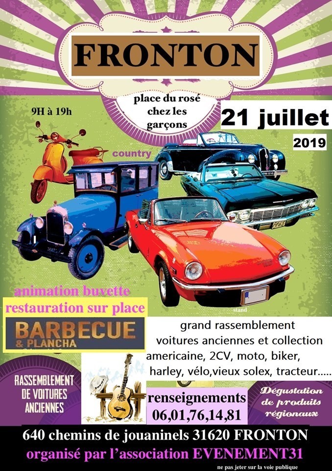 On ne s’ennuie vraiment pas dans notre jolie ville de Fronton. Ce dimanche se sont Daniel et Emmanuel qui nous proposaient une exposition de vieilles voitures et de motos de toutes époques. Bien entendu la restauration était au rendez-vous avec cochons de lait longuement grillés au feu de bois et spécialités des Iles, glaces à la plancha et les gâteaux de « Délices de Lilian » avec bien entendu une animation musicale. Encore un bon dimanche bien agréable.