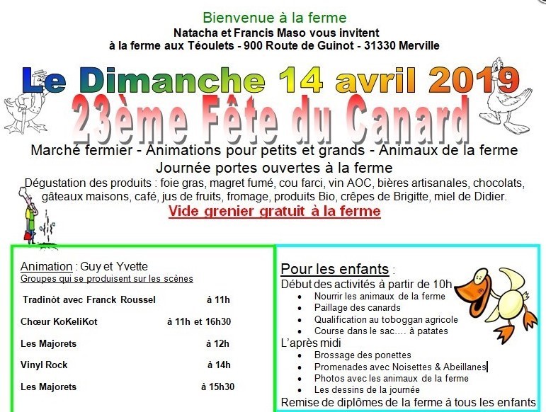 C'est toujours un plaisir de se retrouver à la ferme aux Téoulets où Natacha et Francis Maso organisent comme tous les ans leur traditionnelle fête du canard. Ils en sont à leur 23 éme édition. Avec une animation du tonnerre : des musiciens talentueux, des dégustations des produits de la ferme et des alentours, un marché artisanal ainsi qu’un vide-greniers.