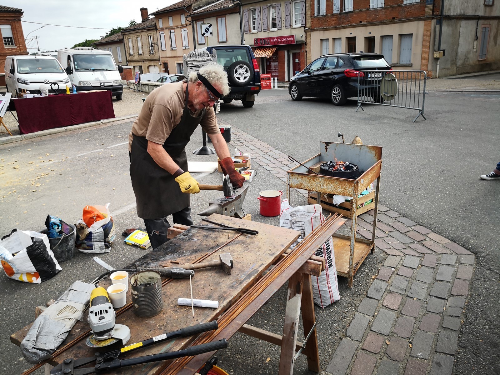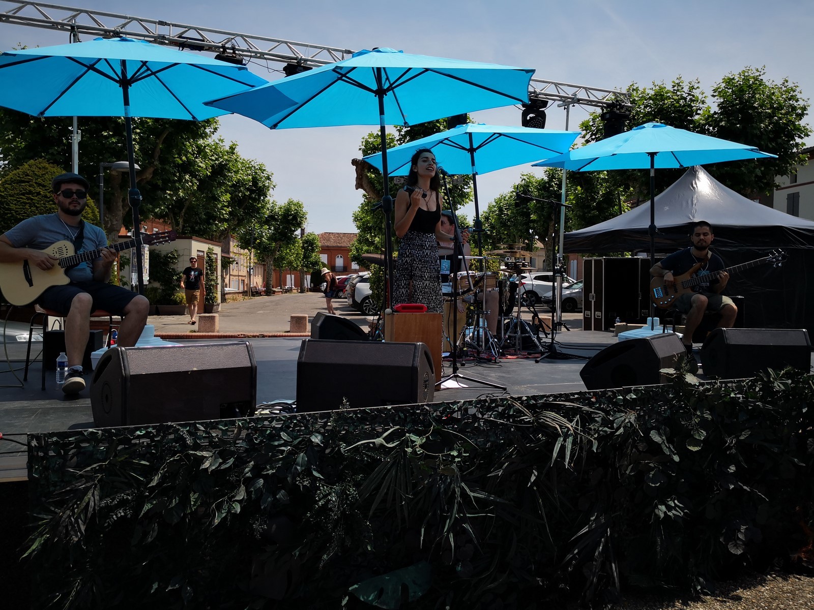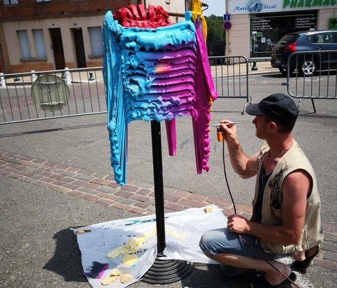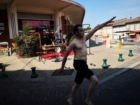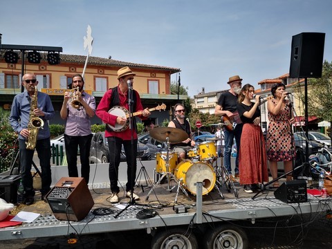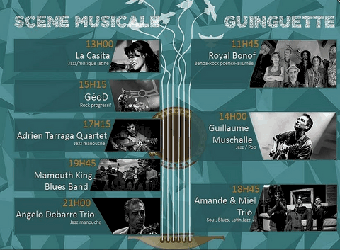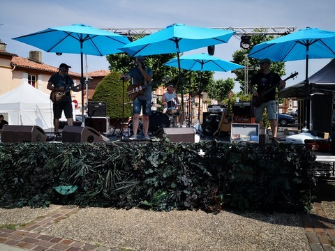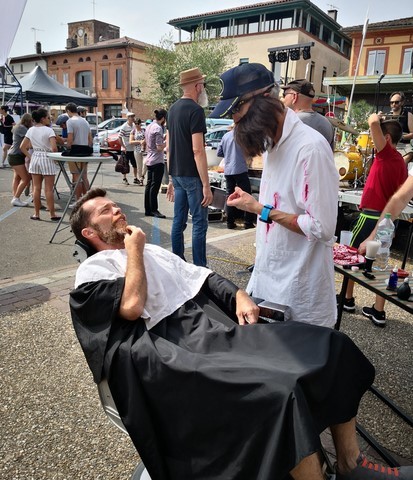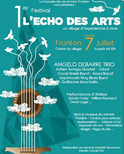 La Canopée des Arts et Echo d'Artistes (nos dynamiques luthiers frontonnais) nous ont offert une journée exceptionnelle ce dimanche dans le centre ville. Ils avaient vraiment pensé à tout, car en plus des orchestres qui se sont succédés sans le moindre répit, des animations étaient prévues pour les moins jeunes : jeux en bois, marionnettistes, conteurs, magiciens, ainsi que des stands où des créateurs proposaient leurs réalisations. Sans oublier d’autres animations qui ont rencontré un franc succès : le yoga du rire, l’hypnose de rue et le cours de swing devant la terrasse de l’Andalou. Les arts plastiques étaient également présents avec Sylvain Croisy, William Raynaud et David Léger qui ont réalisé sculptures et créations sous les yeux du nombreux public. La restauration était bien entendu assurée, les Rouillés s’occupant quand à eux de la buvette où trônait le fameux bouclier de Brennus. Nous avons été enchantés par le programme musical, (comme les artistes étaient tellement nombreux et que je suis un peu faignant, je vous joins l’affiche, cela va m’éviter 15 mns de frappe) avec en point d’orgue Angelo Debarre le King du jazz manouche.