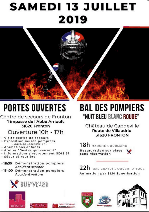Nos pompiers frontonnais nous ont fait découvrir le centre de secours, visite, exposition, animations, démonstrations... Les plus petits ont eu la joie de pouvoir monter dans les véhicules d’intervention gigantesques pour eux et de coiffer les casques de protection avant d’aller jouer dans la structure gonflable ou s’entrainer à utiliser les lances d’incendie. La journée s’est terminée par un marché gourmand où l’on a pu se restaurer avant de danser jusqu’au bout de la nuit devant le château Capdeville superbement éclairé aux couleurs nationale.