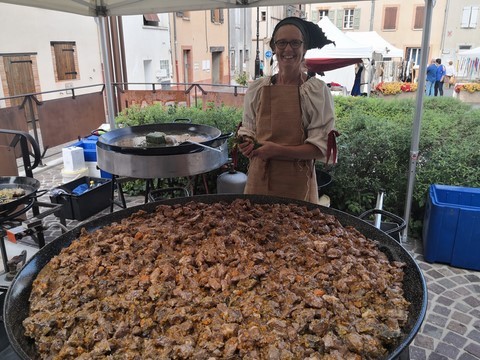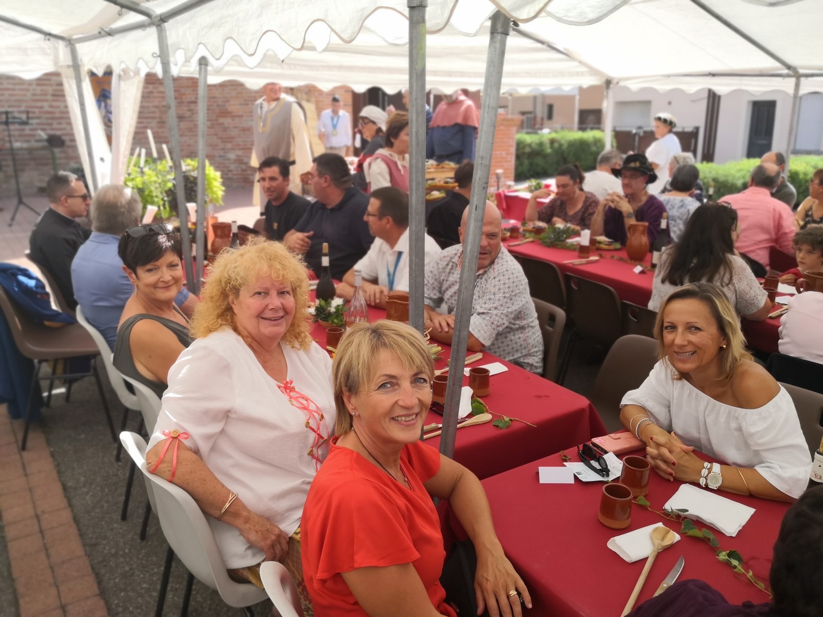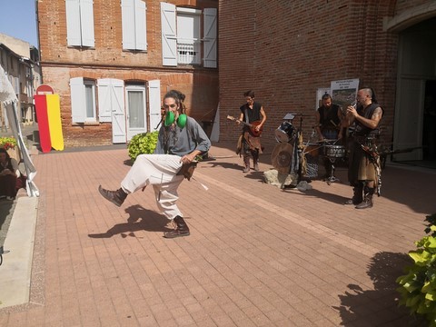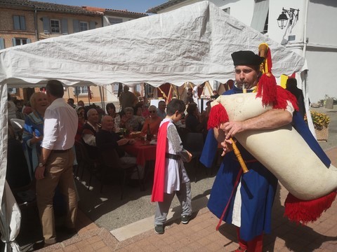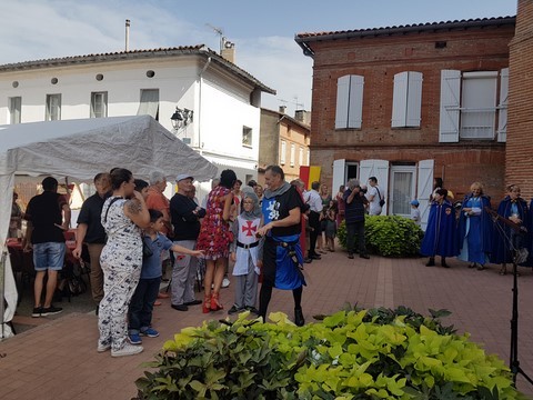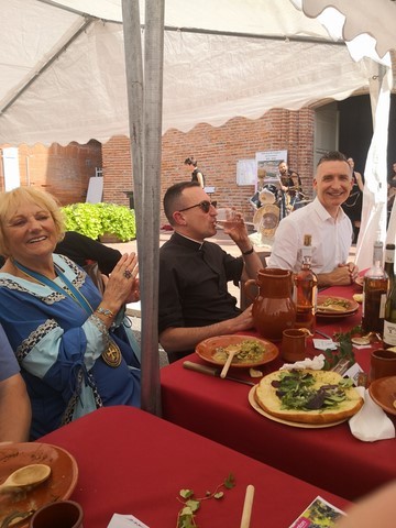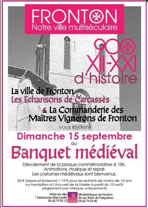 Puis place au moment tant attendu du banquet médiéval organisé par la municipalité avec le concours de l’association « Les Echansons de Carcassès » : pour toute une journée, le parvis de l’église fut transporté au Moyen Age. Costumés en habits moyenâgeux. Attablés devant un véritable repas médiéval ou de passage en centre-ville, les Frontonnais de tous les âges ont eu le grand plaisir d’assister à des danses et des jeux, d’écouter les chanteurs et les crieurs, de regarder les artisans travailler le fer, le cuir, le métier à tisser ainsi que l’art de la calligraphie. « C’est un moment symbolique pour l’histoire de notre ville. Nous avons voulu dépasser le format conventionnel de ce type de célébrations pour mobiliser le plus de monde et mettre ainsi la convivialité au profit de la mise en valeur du patrimoine », avouent de concert Hugo Cavagnac et Jacqueline Coquet.