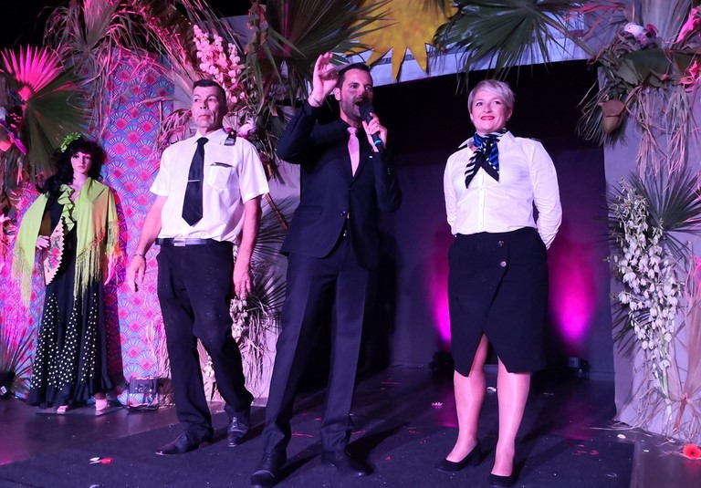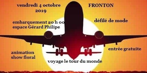 A 20h la salle d’embarquement de l’ Aéroport Gérard Philipe de Fronton s’est remplie et les voyageurs ont pu partir pour un grand voyage autour du monde pour une soirée pleine d’enchantement organisée par nos joyeux stewarts et hôtesse de l ‘air frontonnais : Fabrice Gargale, Valérie Lochon de l’ Art des Sens, Daniel Dall’Armi de l’ Atelier Floral. L'avion a décollé pour parcourir les continents et faire escale dans de bien jolis pays. L ‘occasion de voir défiler des mannequins représentant la boutique LOL de Fronton , Gamins Gamines du Marché du jeudi de Fronton, Rêverie d’Aucamville , Fathers and Son de Fenouillet, et les robes de mariées de Marlene Larozze de Montauban.