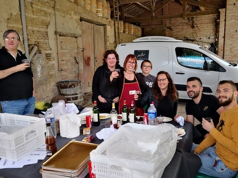 Comme chaque année le château Caze organise sa porte ouverte avec en supplément la possibilité de déguster d'excellents produits régionaux mijotés devant nous. Il y a tout pour constituer un solide et délicieux repas arrosé bien évidemment des meilleures bouteilles du vigneron. Les animations sont nombreuses, expositions de voitures anciennes, country, balade en calèche. Première photo : la sympathique équipe du "Marquisat".