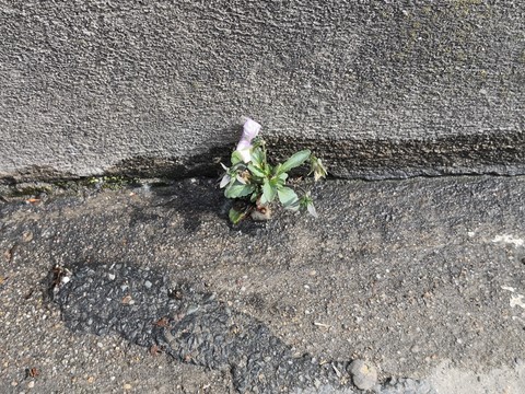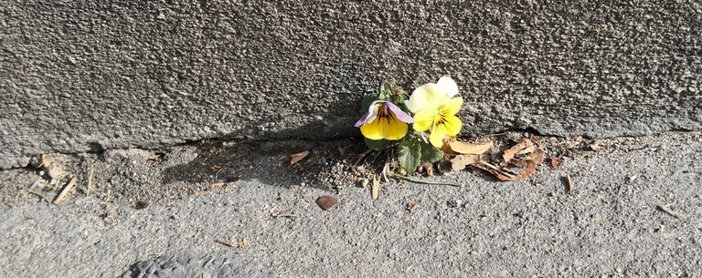 La vie est capable de se loger dans des endroits particulièrement inhospitaliers, ici dans le caniveau en face de chez moi. Cette jolie pensée fleurie en témoigne et nous adresse ce message d’espoir.
