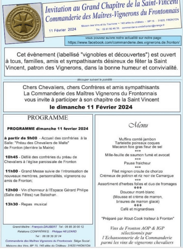 Comme chaque année la confrérie des maitre vignerons organisait la Saint Vincent. De nombreuses autres confréries s'étaient déplacées pour assister à cet événement trés apprécié par les frontonnais.