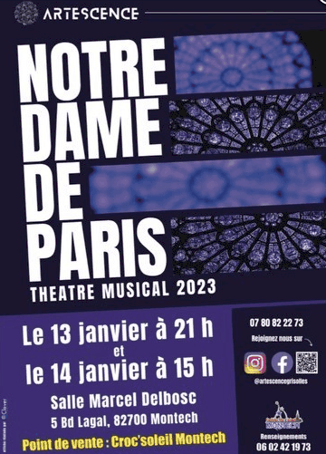 Je n’avais pas pu assister au mois de décembre aux représentations données à Grisolles, cette fois ci je n’ai pas raté le super spectacle « Notre dame de Paris » qui était reprogrammé à Montech par Artescence qui est une association de théâtre musical comprenant une trentaine de membres. Elle est dirigée par Jackie Bezulier qui s’occupe également de la mise en scène. Ces bénévoles s’occupent d’absolument tout, décors costumes et sonorisation. Ce spectacle est absolument magnifique dans tous les domaines et je vous engage fortement à le voir s’il repasse dans la région. Merci à toute la troupe et à Jackie Bezulier pour ce moment de bonheur