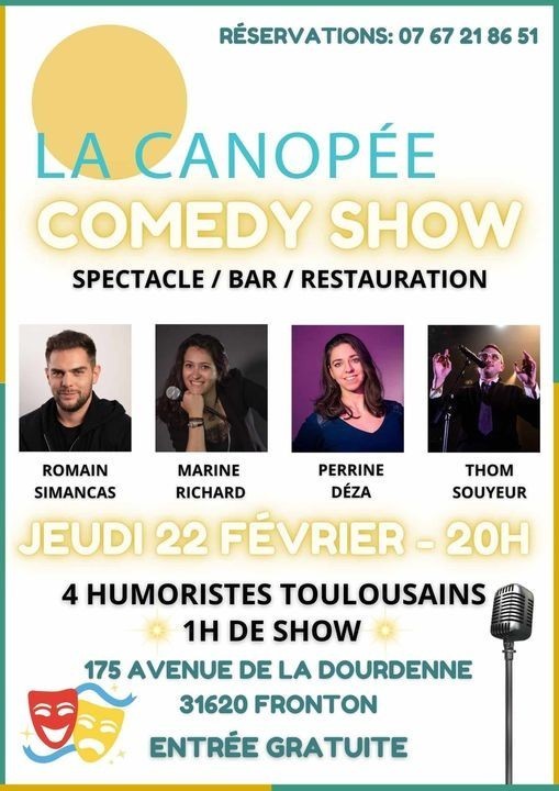 Au menu de ce soir pour la seconde édition du Canopée Comedy Show, 4 humoristes toulousains se sont retrouvés sur les planches de la Canopée ce Jeudi pour une heure de show !