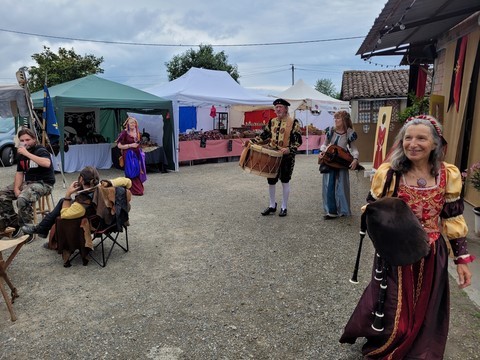 par les ménestrels de la troupe Acanthelys au son de la vielle de la cornemuse et du tambour ainsi que des commerçants habillés de vêtements d’époque.