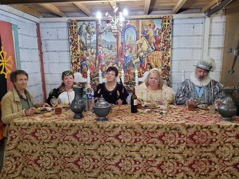 Samedi soir le vilain temps pluvieux a obligé les organisateurs à installer le grand banquet musical à l' abri dans une jolie salle décorée pour l’occasion de tentures. Le menu, hypocras à volonté pour réchauffer les participants,