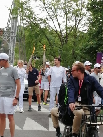 Allumée place Charles Ourgaut, la Flamme Olympique continua sa course rue de la République avant de passer sur le pont suspendu en contre-sens,
