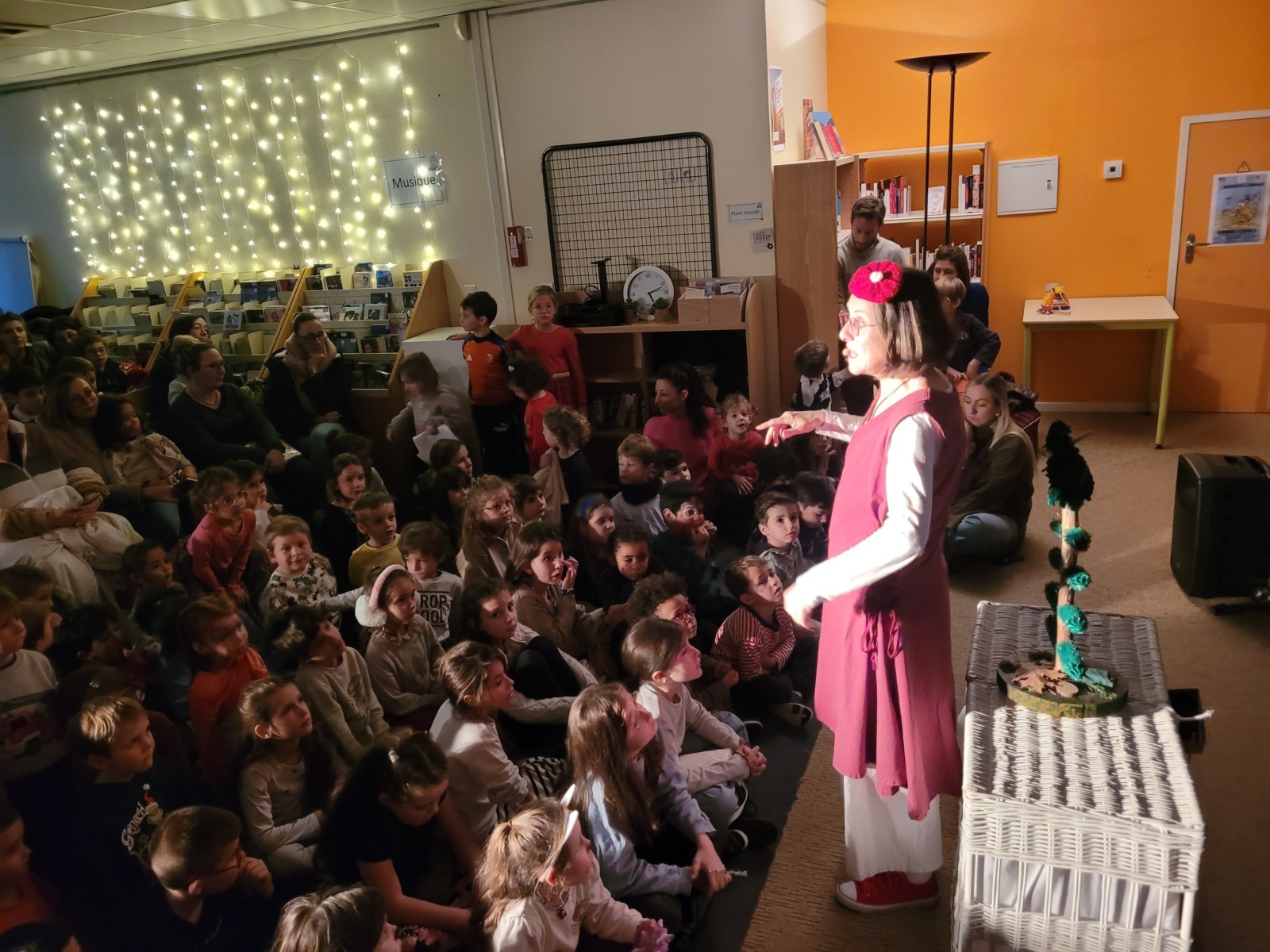 L'heure du conte à la médiathéque, le retour vers le marché et le concert de l'école de musique sous la halle.
