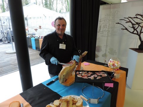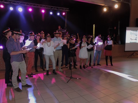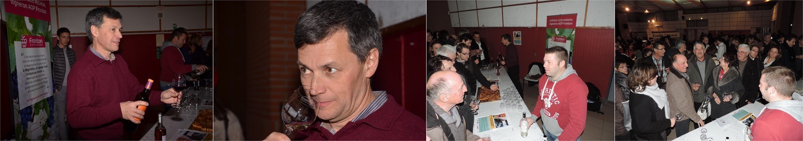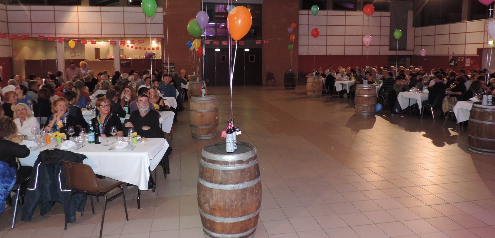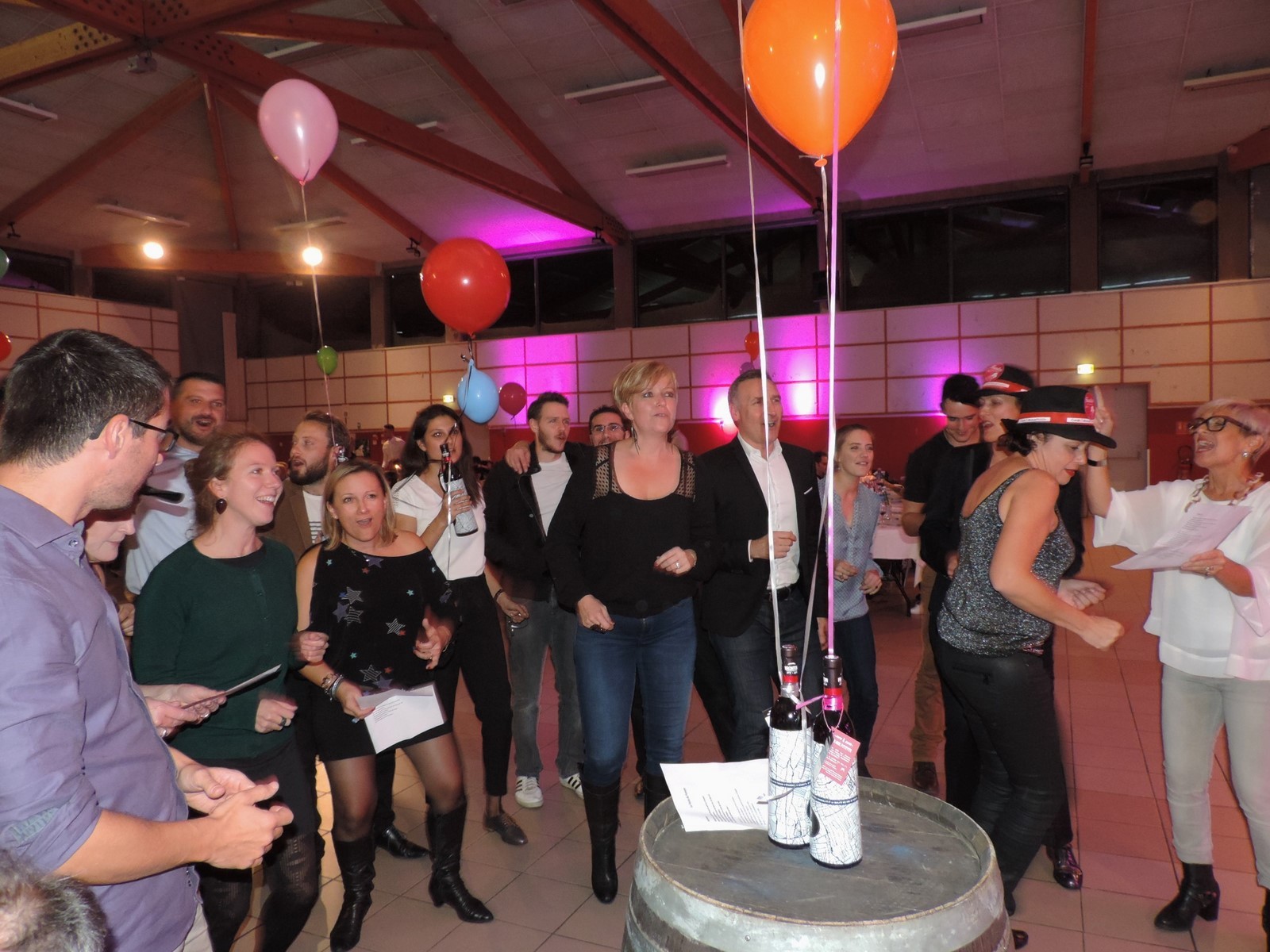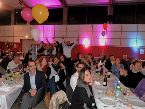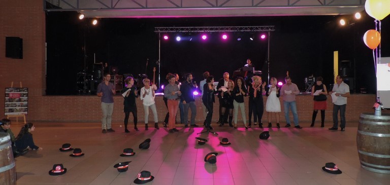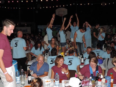 Pour cette seconde édition nous nous sommes retrouvés à l’Espace Gérard Philipe afin de faire la fête avec nos vignerons du frontonnais. La mise en bouche démarra avec la dégustation de jambon, mais pas n’importe lequel : de la Pata Négra dont le producteur nous régala avec des pétales finement découpés. Les vignerons de leur coté nous proposaient leurs meilleurs nectar. Après cette mise en bouche savoureuse, nous avons gagné nos tables, joliment baptisées de nom de cépage de raisin pour débuter le repas. L’orchestre qui animait la soirée devait être bon car rapidement la piste de dance fut envahie et le resta jusqu’à la fin de la soirée. A noter le Karaoké des viticulteurs qui succéde au haka de l'année derniére.