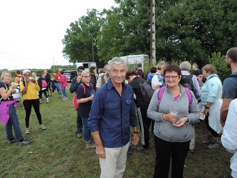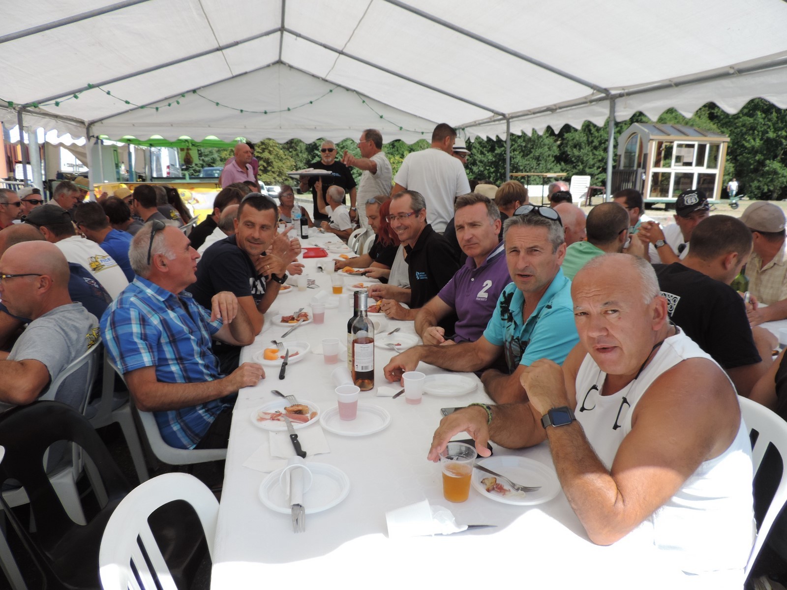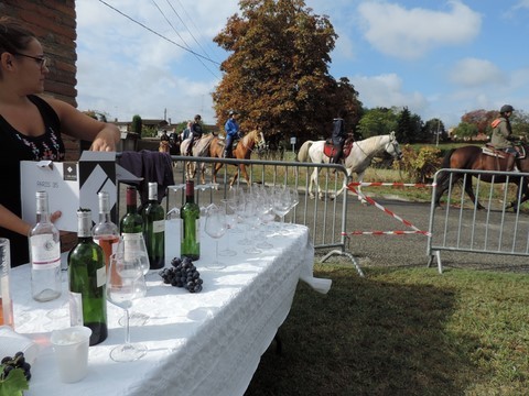 Les cavaliers nous rejoignent devant ce copieux buffet de charcuteries et de fromages ainsi qu'une délicieuse croustade aux pommes, Alain Pradier pour la cave coopérative assurant de manière très efficace le remplissage des verres.