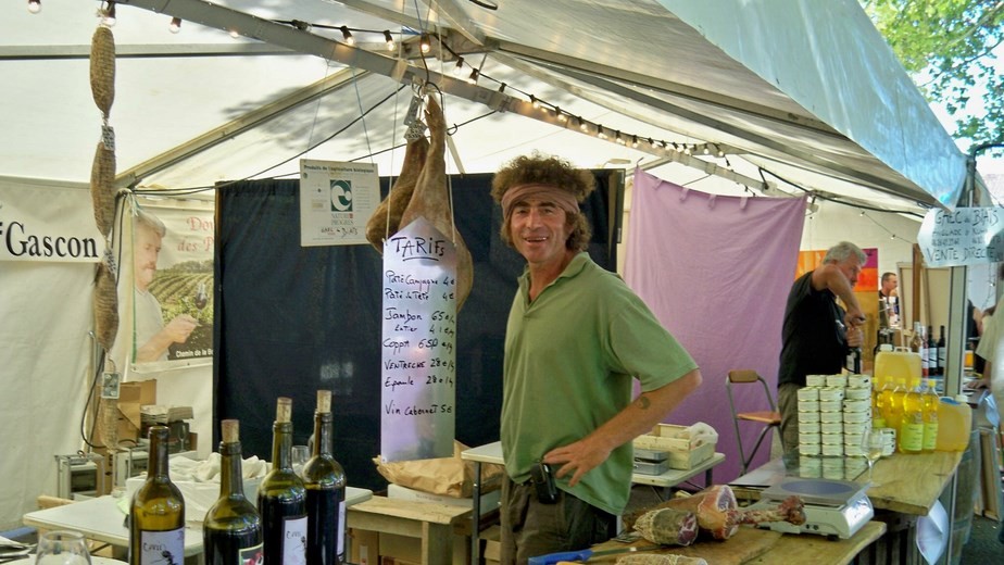 Les produits élaborés à base de porc noir élevés en pleine nature sont présents, Le producteur se prépare à trancher une belle tranche de jambon.
