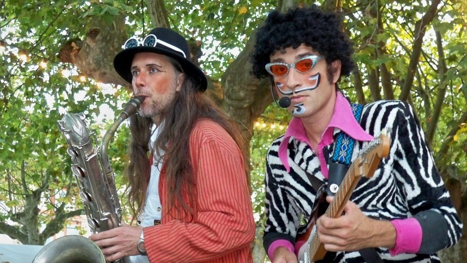 Deux éléments des "LAIT YAOURT BROTHERS" qui perchés sur leurs échasses nous ont offert un récital de musiques du monde.