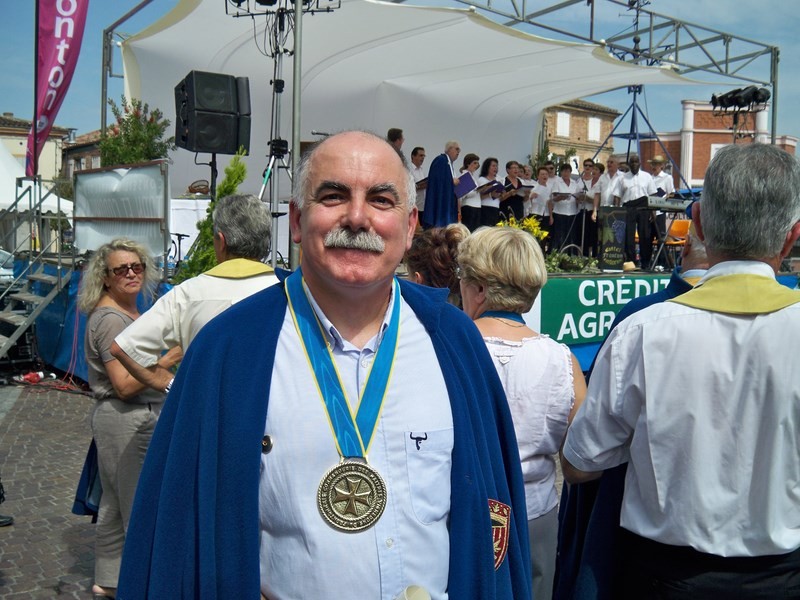 Dimanche, dans la seconde séance d'intronisation, M. Moréno boucher à Fronton rue de la république est honoré.derrière lui se déroule le concert de Chorale frontonnaise.